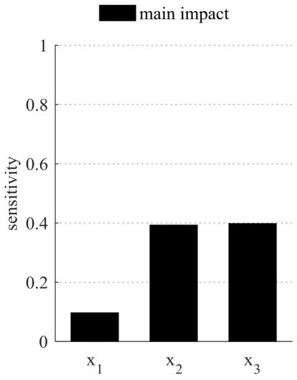 The results in Figure 3 show the global sensitivity analysis’ outcome for the main impacts of each design variable. It presents that variables and have a greater impact on compared to . The main reasons for this are the different coefficients in Equation (4), as well as the multiplication of and .