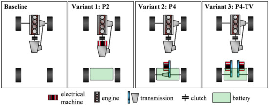 In Variant 1, the baseline powertrain is extended by an electrical machine, which is integrated between the clutch and transmission. This configuration enables a boost functionality, meaning an addition of an engine and electrical machine torque. Mounting of an electrical machine, together with an additional transmission at the rear axle, characterizes Variant 2. In addition to the boost functionality, this topology is capable of all-wheel-drive. Variant 3 extends Variant 2 through the installation of a single-wheel-drive at the rear axle. This allows free torque distribution between the left and right rear wheels. This so-called torque vectoring functionality (TV) enables, for instance, the improvement of cornering with regards to driving stability and velocity. According to [9], these introduced hybrid powertrain topologies are labelled as P2, P4 and P4-TV. These labels are used in further work. For all these variants, a battery is integrated above the rear axle.