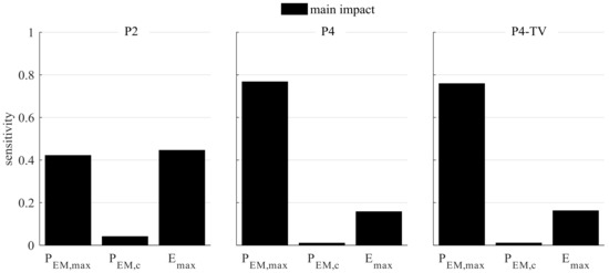 Figure 5 demonstrates the outcomes of the global sensitivity analysis from the application of FAST. It shows the sizing variables’ specific impacts for the three selected hybrid powertrain topologies: P2, P4 and P4-TV.