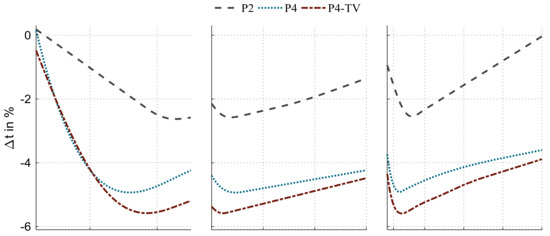Comparison across topologies shows that the FAST’s main impacts regarding are almost twice as big for the P4 and P4-TV topology in comparison with the P2 topology. In relation to the local sensitivity analysis, this is related to the lap time gradients in the range of 20–100 kW. In that range, the P4 and P4-TV designs reveal a gradient twice as big as that of the P2 design. This is because, in the P2 topology, the engine utilizes most of the traction capability at the front wheels. Due to that, the electrical machine can only add torque if the engine is not completely utilizing the available traction at the front wheels. In contrast, the P4 and P4-TV topologies’ electrical machine is able to utilize the entire traction capability of the rear wheels. Furthermore, the P4-TV variant can utilize the traction of each rear wheel separately due to torque vectoring functionality. On this basis, the P4-TV topology outperforms the P4 topology for maximum power sizing above 120 kW. This local difference is not represented in the global sensitivity analysis. This implies that this local difference is not effective in the global solution space to this extent.
