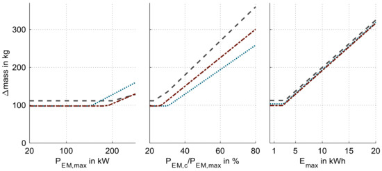 For the masses of the components battery () and electrical machine (), basic functions are postulated in Equations (5) and (6).