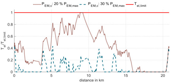 The diagram illustrates the normalized curves of the thermal load over distance for two different sizings of . These curves result from the optimization of the control strategy. For a sizing of continuous power that is 20% the maximum power, the thermal load requires the entire permissible range. Furthermore, the thermal load meets its limit at approximately 8 km. Due to these aspects, restriction of the electric drive operation is concluded. An increase in continuous power to 30% that of the maximum power solves this restriction. The associated profile shows no contact points with the thermal limitation. Furthermore, the utilized range of the thermal load decreases. This resulting thermal degree of freedom enables more frequent and longer operation of the electric drive. Hence, the power throughput rises from 2.8 to 3.3 kWh and, exemplarily, the lap time improves from −4.5 to −5% (Figure 5). A further increase in does not lead to any additional enhancement. It just causes increasing component masses, which is a reason for lap time decreases.