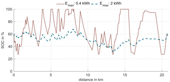 Sizing of the influences the lap time by defining the maximum depth of the discharge level, as well as its dependence on the battery mass. In the same way as with continuous power sizing, values below optimal ones cause functional restrictions and values above optimal ones affects mass increases without functional benefits. Figure 8 points out this functional restriction. The diagram contains the state of charge (SOC) over distance of two different energy content sizings of the optimal P4-TV design (). The initial SOC is set to 60% for each energy content variation.
