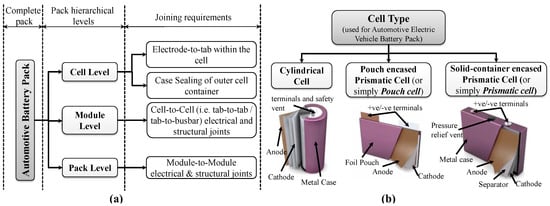 Battery packs of electric vehicles, and hybrid or plug-in hybrid electric vehicles (EVs/HEVs/PHEVs) (a) joining at hierarchical/assembly levels and (b) cell types [5].