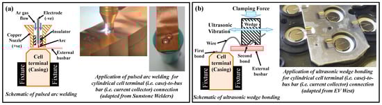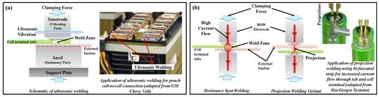 Ultrasonic metal welding (UMW) is one of the most commonly used joining methods for battery systems manufacturing and has been applied to a wide range of metals and thin metal films (e.g., foils). It utilises high frequency ultrasonic vibration, typically 20 kHz or above, to join substrate materials by creating solid-state bonds under a clamping pressure [6]. In principle, high frequency relative motion creates progressive shearing and plastic deformation between mating interfaces and produces an atomic bond at elevated temperature (i.e., typically at 0.3 to 0.5 times the absolute melting temperature of the substrate materials) [7]. However, it needs two sided access, as shown in Figure 2a; one side uses an anvil to support the parts to be joined, and the other side a sonotrode that passes ultrasonic energy to the assembly. Ultrasonic welding is applied for joining of multiple thin foils, dissimilar materials, or highly conductive materials (e.g., Al, Cu, or others) [8,9], especially for pouch cells [10]. However, it may not be suitable for terminal-to-busbar joints of cylindrical or prismatic cells as vibration under pressure may damage structural integrity. UMW has been used for various EVs/PHEVs, including Nissan LEAF, General Motors Chevrolet-Volt, Spark, and Bolt.