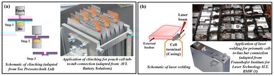 - Module and pack level joining: Module designs typically position positive and negative terminal tabs either at opposite ends or the same end of the cell based on series or parallel connection requirements. Therefore, the cells are joined either by tab-to-tab or tab-to-bus bar connections. Ultrasonic welding has received significant attention for module level joining as a result of its ability to produce good welds for dissimilar materials and multiple thin layers. RSW or projection welding, pulsed arc welding, and clinching of tab-to-tab or tab-to-bus bar joints are feasible. However, process stability, joint characteristics, thermal input, and process control require further investigation. However, feasible soldering of pouch cell interconnects is not recommended as it raises concerns of joint strength under vibration, neutralisation of fluxes, risk of localised heat damage, and creation of debris in the joint area. As an alternative, MPW/EMPT has the potential for joining pouch cell tab-to-tab or tab-to-bus bar [25]. However, detailed investigation is required for MPW/EMPT application, as induced eddy currents may affect the physical parts/electrochemistry (e.g., potential cracks or internal joining between current collectors that leads to battery internal short-circuit) of the pouch cell. To mitigate the risk of damaging the pouch cell, or module sensors, a specially designed weld head and shielding plate may be required during EMPT welding. Laser welding is another alternative solution for pouch cell tab-to-tab or tab-to-bus bar joining. Fibre lasers are able to weld many material combinations including aluminium to aluminium, aluminium to steel, copper to steel, and copper to aluminium. Further investigations are required for fixture design, process parameter optimisation and process control. Generally, pack level (i.e., module-to-module) connections are made with mechanical fasteners.