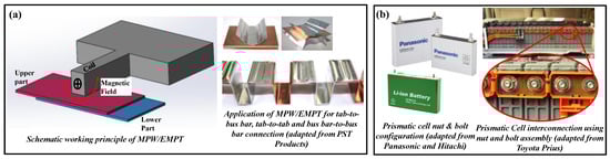 Magnetic pulse welding is a solid state welding process that uses a magnetic pulse to accelerate one part into another, creating a high speed (up to 500 m/s) collision that results in bonding (See Figure 5a). The advantages of this process include low heat input, high joint strength, and the capability to join dissimilar materials [24]. However, as the technology has the potential to create an induced current in the cell, because of the pulsed magnetic field necessary for the joining process, damage may occur, which renders it unsuitable for battery joining. However, MPW/EMPT has the potential for joining pouch cell tab-to-tab or tab-to-bus bar [25]. Furthermore, detailed investigation is required as induced eddy currents may affect the electrochemistry/physical parts (e.g., potential cracks or internal joining between current collectors, which lead to battery internal short-circuit) of the pouch cell. To mitigate the risk of damaging the pouch cell or module sensors, a specially designed weld head and shielding plate may be required during welding.