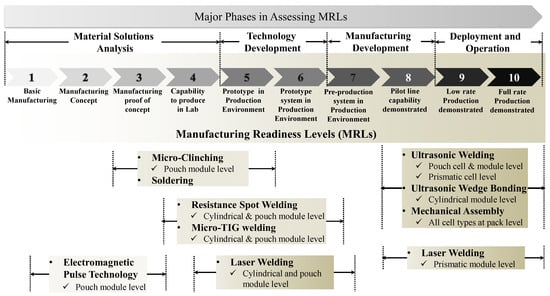 This section maps joining technologies with manufacturing readiness levels (MRLs) to indicate options and development status of battery joining from a manufacturing perspective (as illustrated in Figure 6). Manufacturing readiness levels (MRLs) are used to provide a relative measure of technology maturity, risk level, and extent of application. Ultrasonic welding, ultrasonic wedge bonding, and mechanical assembly are frequently used in battery pack manufacturing (used by battery manufacturers, original equipment manufacturers, and tier 1 suppliers) and have been demonstrated at the highest level of production (MRLs 8–10). RSW, micro-TIG, micro-clinching, and soldering have demonstrated their capability under laboratory conditions (MRL 4) to produce joints for low or batch volume during module manufacture (MRL 6/7). In contrast, laser welding exhibits a broad range of capability from MRL 4 to MRL 10. For example, laser welding applications for module level joining of cylindrical or pouch cells are in MRL 4–6, whereas laser applications for case sealing or module level joining of prismatic cells have been demonstrated at MRL 10. Another joining technology, MPW/EMPT, has a low MRL as it has only demonstrated limited capability under laboratory conditions to produce tab-to-tab joining. Recommendations for further investigation are given in Table 2.