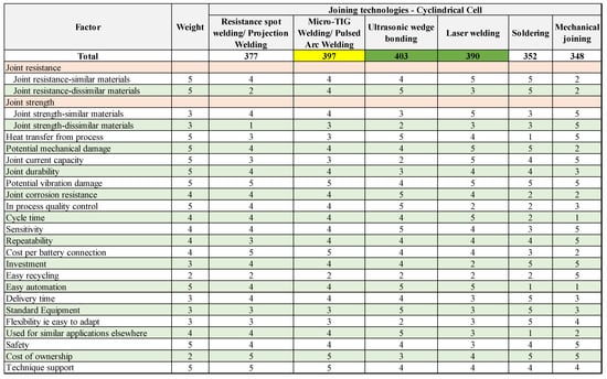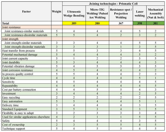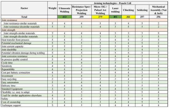 The Pugh matrix has been employed to evaluate different technologies that are suitable for joining cylindrical, pouch, and prismatic cell types, identifying technologies that are likely to be feasible and have favourable risk/benefit characteristics. It is a scoring matrix used for concept selection in which technology options are assigned scores relative to their fulfilment of explicit criteria. The Pugh matrix in Figure 7 identifies three joining technologies, ultrasonic wedge bonding, laser welding (highlighted as “green” as they are in production), and micro-TIG (highlighted as “amber” as it has potential for production application), that would merit further investigation for cylindrical cell battery pack manufacturing. Figure 8 shows current and potential candidates for pouch cell based battery packs, namely, ultrasonic welding, laser welding, micro-TIG, and clinching. Figure 9 demonstrates that mechanical assembly, laser welding, micro-TIG, and ultrasonic wedge bonding have potential for industrial application and warrant further investigation for prismatic cell based battery pack manufacturing.