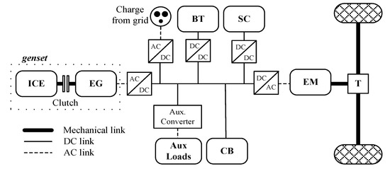 The sizing of the ESS [4,5,6] is commonly addressed during the design stage of a vehicle. Despite the fact that, in a dual ESS based on BTs and SCs, the function of each energy storage unit during operation is quite defined (energy provided by the BT pack and power peak regulation by the SC pack), a proper methodology is still required to define their suitable sizing and to obtain efficient and economic performance. Thus, it can be noted that the system’s sizing and operation are key factors to ensure the fulfillment of the application requirements, the proper harnessing of the onboard energy sources, and the defined economic objectives [7,8]. In close-to-market applications, the economic issue becomes in an important decision factor as the solution has to be competitive and profitable both for the manufacturer and the end-users. Therefore, both technical and economic factors have to be evaluated to develop more efficient and cost-competitive HEBs [9].
