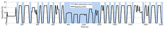 The route profile considered includes several stops (which were considered as zero-emission zones), a maximum speed of 50 km/h, and a travelling distance of around 27 km (round trip). The considered route also included a full-electric operation zone with a driving section of around 2.4 km. Thus, the considered SHEB is intended to operate both in hybrid mode (powered by the genset and the dual ESS) and in full-electric mode (only propelled by the dual ESS). The speed profile depicted in Figure 2 was repeated several times to complete a daily profile of 16 h of operation.