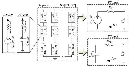 The dual ESS considered is composed of an SC pack and Li-ion BT pack connected on a parallel topology as described in the previous section. The electrical modelling was simplified to limit the computational cost [15]. This was performed considering that the implemented simplified model (described below) would be capable of capturing the most relevant part of the transient voltage variation when responding to varying power demands. A more detailed electric model of the batteries would also reproduce the capacitive nature of the voltage response on the batteries. However, this would have a minimal influence on the obtained results, as the Energy Management Strategy (EMS) described below is defined in terms of the energy demands and the available energy on the ESS.