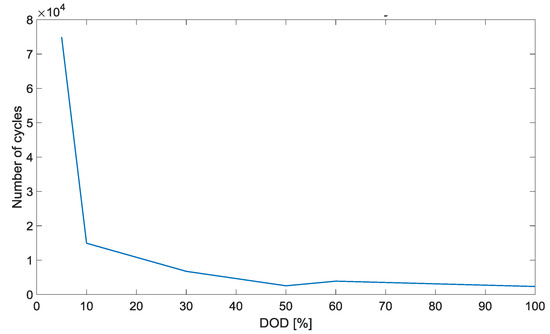 The maximum number of events at each DOD was deduced from the Wöhler curve of the batteries considered. In this case, for the considered LFP-based cell, the Wöhler curve obtained from experimental testing described in [21] was implemented as displayed in Figure 4.