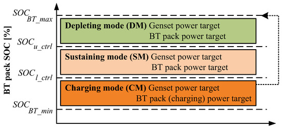 In this operation mode, both the genset and the dual ESS operate together. As depicted in Figure 5, the performance of the hybrid driving mode depends on the State of Charge of the battery () with two defined control levels ( and ) defining the energy mode for the SHEB operation. Thus, within the hybrid driving mode the following energy modes were defined: (i) Depleting mode (DM), (ii) Sustaining mode (SM), and (iii) Charging mode (CM).