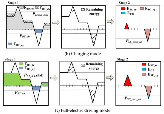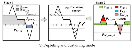 In the first two modes, both the genset and the BT pack supply vehicle energy demands. Figure 6a,b depict the proposed strategy. The power demand at each discrete step is split between the genset and BT and SC packs and mathematically described according to Equations (12) and (13):
