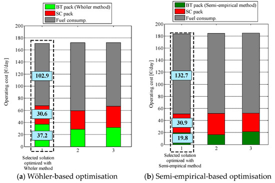 The obtained results suggest a significant influence of the lifetime model’s accuracy on the costs associated with both the operation of the hybrid bus and the sizing of the BT and SC. A difference of up to ca. 8% on SHEB daily operation costs was estimated, depending on the employed lifetime model (170 €/day for Wöhler-based optimisation and 183 €/day for semi-empirical-based optimisation). Similarly, when only dual ESS costs were considered, a difference of ca. 25% was estimated depending on the employed lifetime model (67.8 €/day for Wöhler-based optimisation and 50.7 €/day for the semi-empirical-based optimisation).