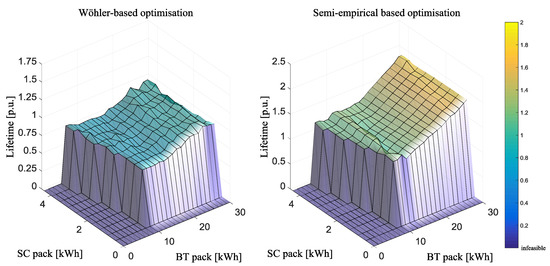 When the semi-empirical lifetime model was employed, the optimisation tended towards a smaller battery sizing. The lifetime of different battery and supercapacitor sizing solutions was evaluated in order to further explore the reasons behind such differences for the optimal case selection. The optimal set of constraints calculated for each selected optimal solution (one for each of the two lifetime models) was maintained while varying only the sizing of the dual ESS. Thereby, Figure 8 shows the variation in the battery lifetime estimation (for each of the two lifetime models) considering the operating conditions defined for each of the two selected optimal solutions. The obtained lifetime values were scaled on a p.u. basis, considering as reference value the lifetime estimated with the Wöhler-curve-based lifetime model (the solution with the greatest lifetime in the leftmost plot in Figure 8 is 1 p.u.).