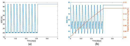 Comparison of the daily battery operation profile for the optimal solutions calculated: (a) with the Wöhler-curve-based and (b) semi-empirical lifetime models.