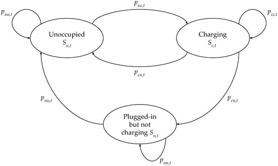 A visual representation is achievable by a state diagram in Figure 1 showing the states in circles along with the transitions probabilities as directed arrows pointing from one state to the available next. Movement between the states is only permitted along the arrows. After a vehicle has arrived at the station, only the “charging” state can follow. During this period, no further vehicle can start to charge. In the case the charging process is complete, but the vehicle is still deployed, the “plugged-in but not charging” state follows. The PEV can also be disconnected even before reaching 100% SOC. In this case, the station becomes “unoccupied” once again. All transitions occur in the transition matrix (Equation (1)) accordingly.