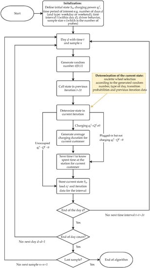 The flowchart in Figure 2 depicts the algorithm: first, the initial state at time must be chosen, which is the starting point of the sequential stochastic process. At this point, further charging characteristics must be defined, including charging power , the simulated time period in days , observed time intervals , e.g., in minutes, and the sample size .