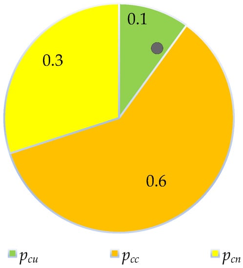 For a stochastic process to become meaningful, probes should be conducted, thus the Markov chain must be run N times for the chosen number of days , after which an average value will be calculated from the iteration data for the observed time intervals . The time dependent elements of the transition matrix (Equation (1)) are derived from the driver behavior such as time of charging, type of day, average initial SOC, average charging duration. Next, the state of the charging station is determined for every time interval within the simulated period using the Roulette wheel selection concept by allocating a randomly generated number among the probabilities for the current time t and previous state . The transition probabilities depend on the time as well as the state in the iteration before, where the surface of the Roulette wheel [] represents a specific row of the transition matrix (see Equation (2)) for the given time t, dividing the wheel into blocks with different surface shares. As Figure 3 also shows, if the generated number falls on a block, the next state is found. For example, if the current state is “charging” and the ball falls on the green field according to the generated number, the next state is “unoccupied” . The data for every observed interval t are stored and analyzed for the given day, simulated time period along with the simulated sample size n. This includes state , charging power , consumed energy and energy not charged for cases when PEV is plugged-in but not charging, where the charging power is assumed to bear a constant value for state when energy is being consumed and otherwise. The equation
