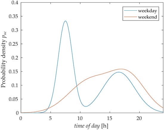 The accuracy of the model depends upon the chosen input parameters used in the algorithm. To identify the elements of the transition matrix (Equation (1)), the following assumptions are made: for the plug-in times of workday commuter traffic as well as for the weekend traffic normally distributed probability density functions from an Austrian study [] are used. These functions are integrated for every hourly interval to calculate the transition probabilities from state to . The curve for workdays suggests that five main periods are distinguished for the remaining sets of probabilities, , , , , and : overnight (from 00:00 to 07:00), morning rush (from 07:00 to 09:00), working hours (from 09:00 to 17:00), evening commute (from 17:00 to 22:00) and evening (from 22:00 to 24:00). On the other hand, a weekend day has one assumed a general set of probabilities, , , , , and . The probability density functions and the other sets of probabilities are shown in Figure 4 and Table 1, respectively.