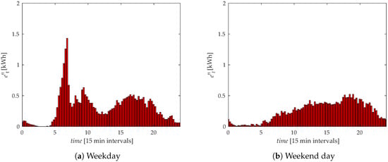Figure 5a shows the typical consumption of one weekday. As the charging station is either charging a PEV or not, the power is either 22 kW or 0 kW. Thus, Figure 5b,c also shows the average consumed energy in each interval for N runs for the two different types of day. It is important to note that caused by the random number generation in the time intervals, each run of the algorithm in Figure 2 brings a slightly different result; nonetheless, all results follow the curves in Figure 4 apart from slight deviations. For example, before and after the morning rush, there is a higher assumed likelihood of leaving the PEV plugged-in without actual charging. This is shown in Figure 6a, where there are two peaks before (from 6:00 to 7:00) and after (from 9:00 to 10:00) the morning rush period, meaning a higher amount of energy not being sold, while the station is occupied. The total amount of energy not being sold may be calculated by the charging stations capacity and the charging demand. In fact, Figure 5 shows it indirectly by the difference in electricity demand and charging station’s capacity times (in our case, ). In this case, monetary energy losses for the CSO of the charging station occurs.