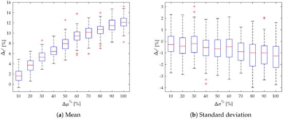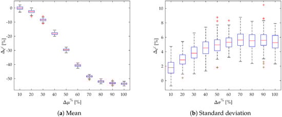 Whether the charging process is still within the average charging duration has a huge impact on the probabilities used (see also Table 1). The box plots in Figure 7 show to what percentage the consumed energy in a weekday responds to changes in parameters of the normal distributions in Section 3. If the mean is increased in 10% steps , then the mean of the consumed energy is also rising in Figure 7a. On the other hand, a similar increase in the standard deviation values does not implicate a rise in consumption Figure 7b.
