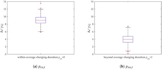 Time intervals under the condition “plugged-in but not charging” mean that no energy can be withdrawn, even though the station is occupied (Figure 6). The following considerations try to eliminate the huge impact of the state in the Markov chain results. Thus, we assume that only the two states “unoccupied” and “charging” exist. In the case of the probability set to 0 within the average charging duration (see Table 1), the energy consumption shows a significant increase according to Figure 9a. If the probability of jumping back from to beyond the average duration is set to 1, the load slightly increases as Figure 9b depicts.