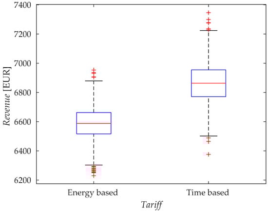 The assumptions of the case study are applied to calculate the annual revenues of the CSO. The model is run for a sample size of , after which Equations (5) and (6) in Section 2.3 are utilized for the retrieved results. Figure 10 shows the resulting box plots for the CSO’s annual revenues for the introduced two energy charging tariffs. In this case, EUR/kWh [], = 4.8 EUR/h [] (both from Austrian based CSOs).