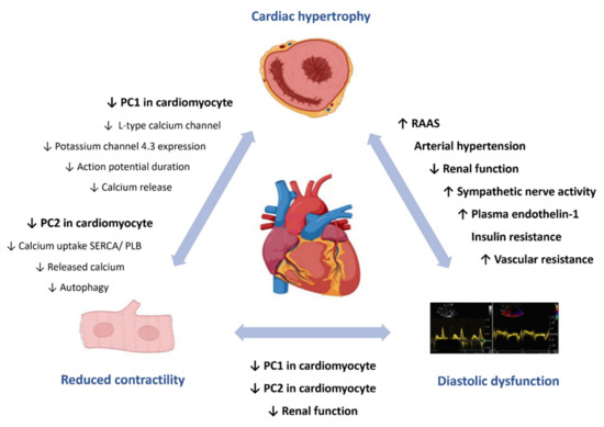 PC1 and PC2, the PKD1 andPKD2 products, are essential for the development of the heart. One of the major sites of PKD1 expression is in the developing and mature cardiovascular system [105]. Moreover, PC1 has been found to regulate L-type calcium channel protein levels through the AKT pathway and cardiomyocyte contractility in a mouse model, suggesting a crucial role for this protein in cardiac function [108,109,110]. PC1 has been shown to act as a mechanosensor in cardiomyocytes, required for stretch-induced cardiomyocyte hypertrophy as well as for pressure overload-induced hypertrophy [108]. PC1 is a critical modulator of apoptosis and fibrosis. Cardiomyocyte PC1 plays a pivotal role in regulating fibroblast-to-myofibroblast differentiation, with implications for cardiac fibrosis and remodeling [111]. Also noteworthy is the fact that mice harboring a cardiomyocyte-selective conditional silencing of PC1 do not develop fibrosis after being subjected to transverse aortic constriction [108], supporting the role of this protein in cardiac remodeling. Moreover, PC1 mitigates cardiac damage during ischemia/reperfusion, likely through AKT activation, and regulates the connective tissue growth factor expression in cardiomyocytes [111]. The cardiomyocyte-specific deletion of PKD1 impairs the systolic and diastolic functions in mice [112].