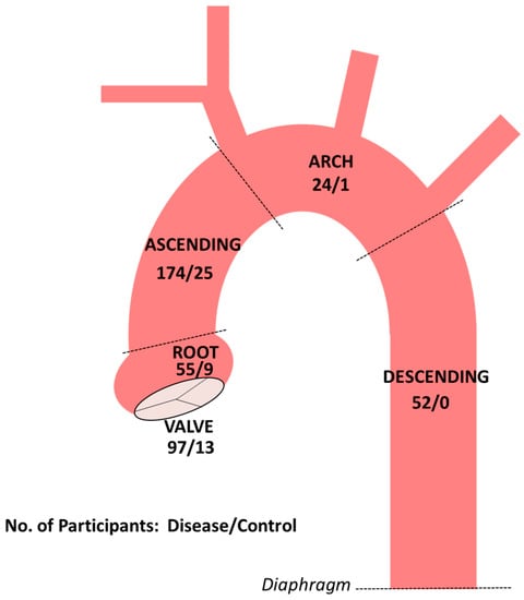Numbers of aortic and aortic valve tissue samples collected to date in participants with aortopathy or aortic valve disease and normal controls. Dashed lines demarcate the boundaries of thoracic aortic segments.