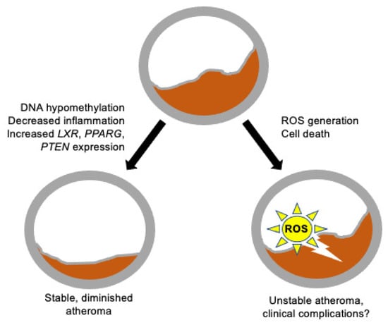 Challenges in NP-based AS therapy. Left, proposed therapeutic strategy consisting of lowering DNA methylation levels close to the ones observed in the unaffected portion of the artery. DNA hypomethylation is accompanied by activation of anti-inflammatory, antiatherogenic gene transcription. Right, cancer therapy-inspired strategy to erode atheroma mass by inducing cell death. The generation of reactive oxygen species (ROS) is presented as an example. Although providing extremely useful insights into mechanism of atherosclerosis, a possible pitfall of strategies aimed at inducing cell death is the risk of atheroma rupture. LXR, liver X receptor; PPARG, peroxisome proliferator-activated receptor gamma; PTEN, phosphatase and tensin homolog.