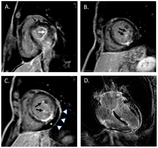 Cardiac MRI acquisitions obtained late after contrast injection, showing multiple areas of late gadolinium enhancement (LGE, “bright signal”) simultaneously affecting the endocardium, the myocardium and the pericardium. (A) short-axis view images documenting LGE involvement of mitral valve anulus (white arrow) and (B,C) left ventricular papillary muscles; (C) short-axis mid papillary view showing mild pericardial effusion (asterix) and pericardial enhancement; (D) four-chamber view image showing diffuse myocardial LGE involving left and right ventricles and both atria.