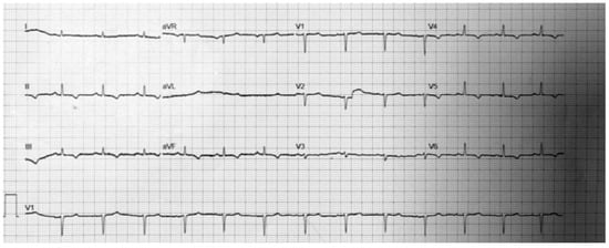 At our Unit, the patient appeared well, without signs of dyspnea or diaphoresis. Her pulse was 73 beats/minute, blood pressure was 110/70 mmHg, respiratory rate was 18/minute, and hemoglobin saturation was 99% while she was breathing ambient air. A 12-lead ECG was performed, showing repolarization abnormalities in inferior leads without PR depression or other signs of pericarditis (Figure 2). Extended microbiological screening, comprehensive of cultures of blood and stool for ova parasites and serum antibodies for Strongyloides spp. excluded parasitosis. Anti-neutrophil cytoplasmic antibodies (ANCA) and antinuclear antibodies (ANA) were absent. A real time polymerase chain reaction (RT-PCR) nasopharyngeal swab for SARS CoV 2 ruled out Coronavirus infection.