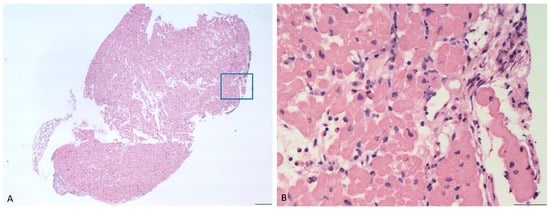 (A) Endomyocardial biopsy specimen, showing at higher magnification (B) an interstitial inflammatory infiltrate with eosinophils (Haematoxylin and eosin, scale bars 200 micron (A) and 50 micron (B).