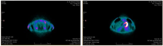 EGPA was then diagnosed according to the ACR criteria []. Of note, the absence of ANCA and the 18-FDG uptake pattern could orient the diagnosis towards hematologic malignancies. However, it should be noted that the prevalence of ANCA-positive patients is lower in EGPA than in other small-vessel vasculitides (40%) []. In particular, younger age and higher prevalence of refractory asthma and cardiovascular involvement have been reported among ANCA-negative patients []. Whole-body 18-FDG PET may not show the typical pattern of increased uptake in the paranasal sinuses in 30% of the cases: mild mediastinal 18-FDG uptake may reflect chronic inflammation rather than hematologic malignancy. Pancarditis is a rare presentation of EGPA, and is associated with a high risk of systolic dysfunction and evolution to a dilated or restrictive cardiomyopathy [,]. The history of asthma and nasal polyposis, in association with peripheral eosinophilia, could represent useful red flags of an underlying EGPA.