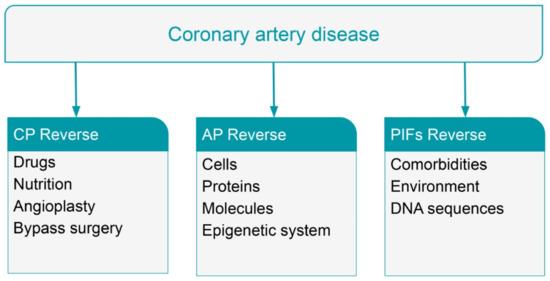 Potential reverse (partial or complete) of coronary artery disease (CAD) at the level of clinical phenotype (CP) or atherosclerotic plaque (AP) or Phenotype Influencing Factors (PIFs).