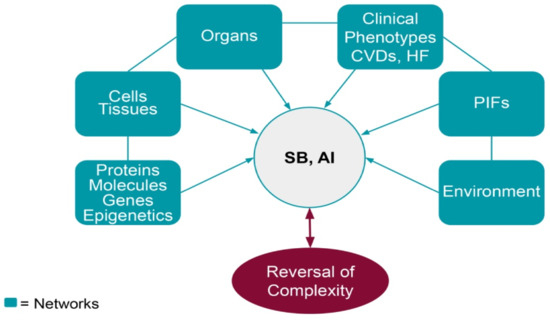 To understand the concept of the holistic principle of SB and its application to the disease reversal hypothesis, we should briefly address some recent developments in biology. Modern Synthesis (neo-Darwinist) is a theory of evolution based on the reductionist approach as a gene-centered theory of evolution, where a specific biological structure is broken down into its fractions in order to understand the chemical principles underlying molecular activities. A new theory called the theory of Biological Relativity is proposed to replace Modern Synthesis, as it is based on the integration of a variety of interacting mechanisms and networks that are dynamically functional [6]. The proposed conceptual theory of Biological Relativity or Integrative Synthesis is based on integrated systems of complex networks while the “active causation resides in the networks which include many components for which there are no deoxyribonucleic acid (DNA) templates”; and “it is the physics and chemistry of those dynamic networks that determine what happens” [7]. Genes are considered passive causes and they are activated through a variety of cellular mechanisms; rather “active causation lies with proteins, membranes, metabolites, organelles, and the dynamic functional networks they form in interaction with the environment” [8]. Dynamic analysis of cancer cellular networks “allowed biological studies to move from a reductionist approach, such as isolation of specific pathways and mechanisms, to a more integrative approach, where biological systems are seen as a network of interconnected components” [9]. The holistic principle of downward (top-down) causation in the biological ladder with an integrated systems view differs from the reductionist approach that understands biological reality as upward (bottom-up) causation [10]. The reductionist approach assumes that sufficient details are available about lower-scale processes; a fact that is untrue. The integrative network analysis and the constraint-based thinking are important tools for having a better understanding of the intrinsic complexity of CVDs and HF [11,12].
