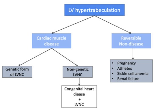 - Stöllberger, C.; Finsterer, J.; Blazek, G. Left ventricular hypertrabeculation/noncompaction and association with additional cardiac abnormalities and neuromuscular disorders. Am. J. Cardiol. 2002, 90, 899–902. [Google Scholar] [CrossRef]