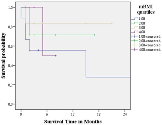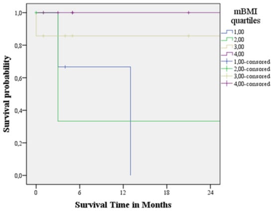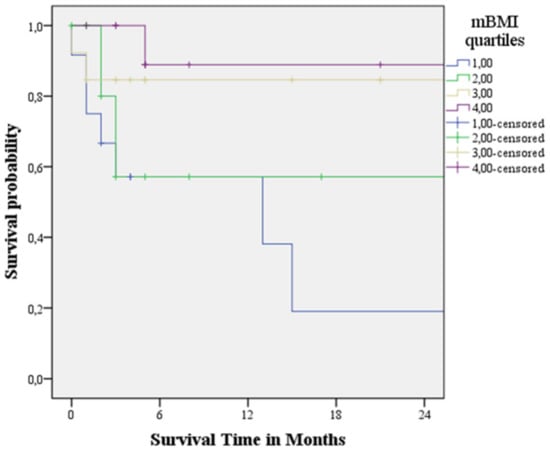 NYHA functional class (β 2.550; p < 0.013), mBMI (β 0.996; p < 0.001), HS-cTnI (β 1.001; p < 0.002) and E/Em ratio (β 1.064; p < 0.011) were significantly associated with cardiovascular mortality in the study population. Multivariate analysis was introduced into the model, along with a set of variables that were considered significant on univariate analysis for p-values < 0.25 (NYHA functional class, cBMI, nBMI, mBMI, HS-cTnI, LVGLS, E/Em ratio, TAPSE, s’ wave). In the multivariate analysis, mBMI emerged as an independent predictor for adverse cardiovascular events (β 0.996, IC95% 0.994–0.999; p < 0.006). In both AL and ATTRwt group, the lowest mBMI quartile was associated with the worst cumulative survival (Figure 1, Figure 2 and Figure 3).