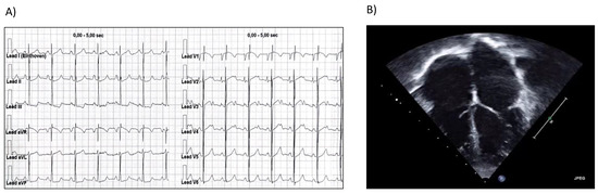 Proband’s instrumental evaluation (EGG and echocardiogram). (A) ECG shows normal sinus rhythm, bi-atrial enlargement and ST segment depression in inferior leads. (B) Echocardiogram shows an RCM: bi-atrial enlargement and normal ventricular volume.