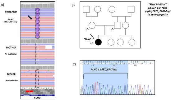 Following genetic counseling, Next Generation Sequencing (NGS) testing was performed with a panel of 174 genes using the TruSight™ Cardio Sequencing Kit (Illumina Inc., San Diego, CA, USA). No causative variants associated with the disease were identified. Thus, the NGS data were re-analyzed using clinical exome sequencing. Assessment of the clinical exome on the patient/parent trio identified the variant c.6527_6547dup p. (Arg2176_2182dup) in the FLNC gene, in heterozygosity (Ensembl transcript id ENST00000325888.8; Genebank transcript id NM_001458.5). Sanger sequencing was used to confirm the variant, which was not present in the DNA of the proband’s parents and was adjudicated as de novo. It is an inframe duplication of 21 base pairs, not present in the database of allele frequencies GnomAD, and has not been previously described in patients. According to the ACMG guidelines [23], the variant classifies as likely pathogenic. Being a de novo variant, the younger sister of the proband was not tested (Figure 2).