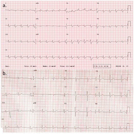 Follow-up ambulatory ECG (Figure 1b) showed low voltage QRS complexes in the limb leads, and a fragmented QRS complex in lead III, without ventricular pre-excitation or repolarization abnormalities, namely, prolonged QT interval, Brugada pattern, or abnormal T wave inversion. 24 h-Holter monitoring (with bisoprolol therapy) documented 322 premature ventricular contractions but no periods of nonsustained ventricular tachycardia. Stress testing revealed a normal exercise capacity with no exercise-induced arrhythmias or repolarization abnormalities. A flecainide test did not show an ECG pattern suggestive of Brugada syndrome.
