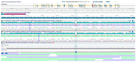 Genetic testing (extended cardiomyopathy 196 gene panel—Figure S3) revealed a previously undescribed variant in the MYH6 gene (NM_002471.3; chr. 14), (OMIM * 160710); c.3673G>T p.(Glu 1225*) (Figure 4)—a variant not present in the population databases (ACMG 2015 PM2) that introduces a premature stop codon. After multidisciplinary discussion with the Genetics department, the authors consider this is a possible pathogenic variant of the MYH6 gene, originating a truncated protein. Although PVS1 criteria were not met, according to ACMG 2015, this is a frameshift variant, predicted to undergo nonsense-mediated RNA decay, and the exon is present in biologically relevant transcripts. Genetic testing and clinical screening (including ECG, Holter monitoring, TTE and CMR) were also performed in the patient’s children. The patient’s 23-year-old daughter was positive for the aforementioned truncating MYH6 variant, with an ECG showing low QRS voltages in the limb leads, a terminal activation duration of QRS ≥ 55 ms in V1, and inverted T waves in leads III and aVF (Figure S4). However, her CMR did not show any structural LV or RV abnormalities or LGE. Despite our recommendation, the patient’s siblings declined undergoing clinical screening or genetic testing for the MYH6 variant.