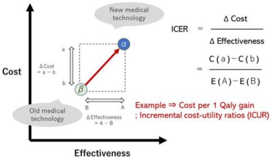 Methods for measuring and analyzing the utility values of patients based on their health-related quality of life (QOL) have been developed and are continuously improving. A cost–utility analysis (CUA) applies this concept to a cost-effectiveness analysis (CEA). When a utility function is applied to a cost-effectiveness calculation, medical value is determined as a “resource consumption (mainly direct medical costs)/health recovery (patient outcomes such as utility)” [], with one outcome being the global index “quality-adjusted life years” (QALYs). This concept integrates the utility value for a patient and the number of years of life and discusses both quantitative (life prognosis) and qualitative outcomes (QOL) []. The incremental cost–effectiveness ratio (ICER) can be a “yardstick” for judging whether cost-effectiveness is superior or inferior. The formula for the ICER is the difference between the cost (b) of similar technology β and the cost (a) of new medical technology α (that is, (a)–(b)) divided by the difference between the effectiveness (B) of similar technology β and the effectiveness (A) of new medical technology α (that is, (A)-(B)) (Figure 1) [,,]. These concepts are included in cardiovascular field guidelines, such as those of the American Heart Association (AHA) in the United States [].