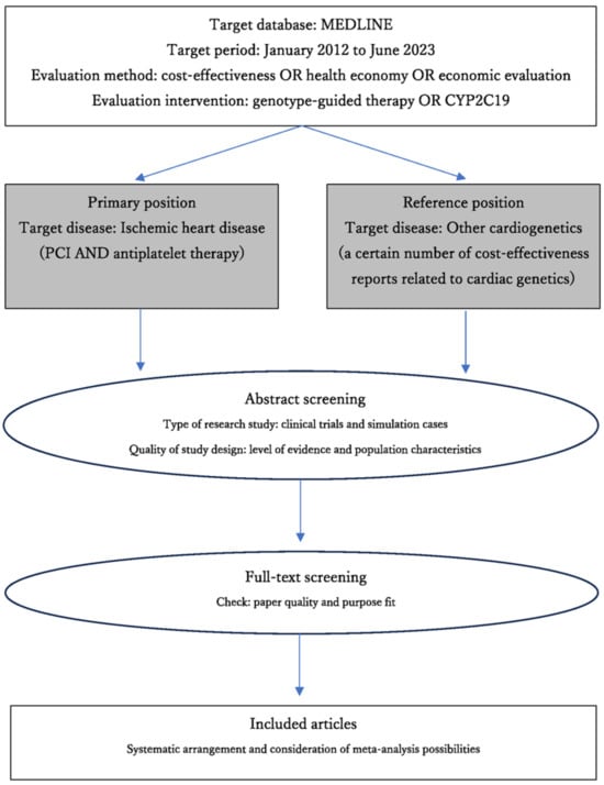 This study aimed to consolidate evidence and advance the discussion on economic factors of healthcare related to cardiac genetics, with a focus on P2Y12 inhibitor selection based on the CYP2C19 loss-of-function allele. Furthermore, based on the information obtained, the procedural aspects of cost-effectiveness evaluations were considered, focusing on the characteristics of cardiac genetics while factoring in the trends in oncology cardiology practice. The literature reviewed in this review was limited to studies with evidence from clinical trials and similar protocols. Therefore, in examining the comparisons of outcomes between medical technologies, reports of complementary simulation studies (model calculations) were excluded if no comparison of test results from clinical trials or other studies were included. This exclusion was due to the limited ability to rigorously discuss the level of evidence and the difficulty of meta-analysis ([,]; Supplementary Material S1, Supplementary Material S2). Therefore, the area of genetic screening for familial hypercholesterolemia FH (identification of subjects by genetic screening), which is discussed later in this review, was positioned as a reference, and only simulation studies that specifically discussed clinical impact were addressed.