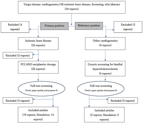 During our literature review, I identified 34 medical reports related to cardiac genetics (including those on ischemic heart disease) (Figure 3). Of these, 13 were excluded because of their research content and design. Two studies focused on the medical economics of treatment strategies based on cardiac genetics (FH), whereas the others concentrated on the cost-effectiveness of drug selection (GGT) based on the CYP2C19 LOF allele. I finalized nineteen reports related to antiplatelet therapy after PCI and two reports (treated as references) on genetic screening for FH [,,,,,,,,,,,,,,,,,,].