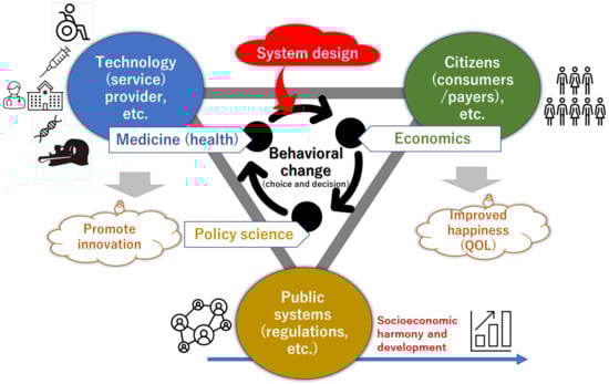 Although not included in this study because of the limited sample size, several other studies have focused on the cost-effectiveness of cardiac genetics. For example, statin therapy based on the polygenic risk score (PRS), which is the sum of the contributions of SNPs to disease development, has been shown to be cost-effective []. Thus, health economic evaluations related to cardiac genetics should be further developed as they can greatly aid clinical practice and contribute to socioeconomic conditions. To support the advancement of medical technology, a social system that encourages and accepts technological progress is necessary []. A system design that harmonizes people, technology, and society to a greater degree must be developed into a socioeconomic mechanism (e.g., medical and industrial policies). Medical science, economics, and policy studies must collaborate to promote behavioral changes in the people involved and advance medical innovation and national welfare (Figure 5). Health economic evaluations associated with the further development of cardiac genetics can serve as catalysts for such discussions.