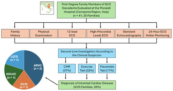 Previous studies have investigated various diagnostic approaches for family members of SCD decedents. All study protocols included a similar initial diagnostic work-up, which involved gathering information on the circumstances of death, family and medical history, physical examination, ECG, echocardiography, and exercise testing [11,12,13,14,15]. For instance, Van der Werf et al. investigated 140 families with sudden unexplained death, diagnosing 33% of cases [11]; in that study, long QT syndrome was the most prevalent diagnosis. Similarly, Behr et al. investigated 109 first-degree family members of 32 people who died of sudden arrhythmic death syndrome (SADS), defined as decedents with normal cardiac pathological findings and negative toxicological tests [12]; the cardiological work-up included physical examination, ECG, echocardiography, and Holter monitoring, and 7 (22%) of the 32 families were found to have an inherited cardiac condition, with long QT syndrome being the most common, identified in four cases. Other diagnoses included non-structural cardiac electrophysiological disease, myotonic dystrophy, and hypertrophic cardiomyopathy [12]. Additionally, Tan et al. investigated 43 consecutive families with one or more sudden unexplained death victims who died before 40 years of age [13], and inherited cardiac disease was detected in 40% of cases (17/43 families); in this study, catecholaminergic polymorphic ventricular tachycardia and long QT syndrome were the most common diagnoses, and the likelihood of diagnosis increased when more family members were examined and when more than one sudden unexplained death occurred in the family.